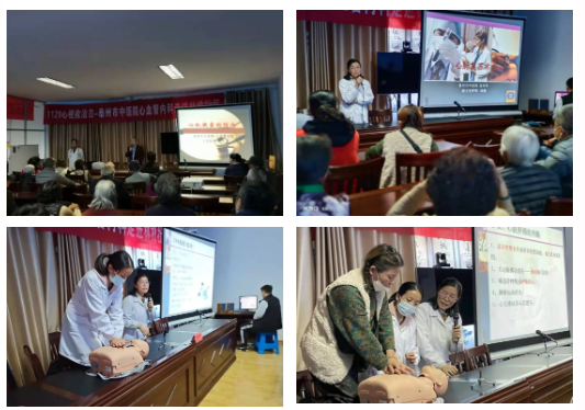 活動(dòng)現場(chǎng),心內科曹軍主任圍繞急性心梗的癥狀及表現、急性心梗的治療、健康生活方式等方面向現場(chǎng)的居民介紹心肌梗死的防治知識,提高廣大群眾對急性心梗的早識別和早就診意識。急診科邱燕和心血管病科趙娟兩位護士長(cháng)現場(chǎng)演繹了心肺復蘇急救正確步驟并指導群眾進(jìn)行心肺復蘇操作,幫助大家了解和懂得急救技能,在醫療救護人員趕來(lái)之前,能夠首先采取正確的急救措施,有效挽救生命、降低傷害程度。