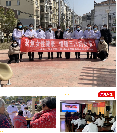 3月7日,第六黨支部走進(jìn)京泰路街道金東社區,開(kāi)展“關(guān)愛(ài)女性健康,創(chuàng )建幸福家庭”健康服務(wù)活動(dòng)。普及女性衛生保健知識、飲食安全、合理用藥等健康常識,認真解答關(guān)于常見(jiàn)病、多發(fā)病的預防診治及愈后疑難問(wèn)題。
