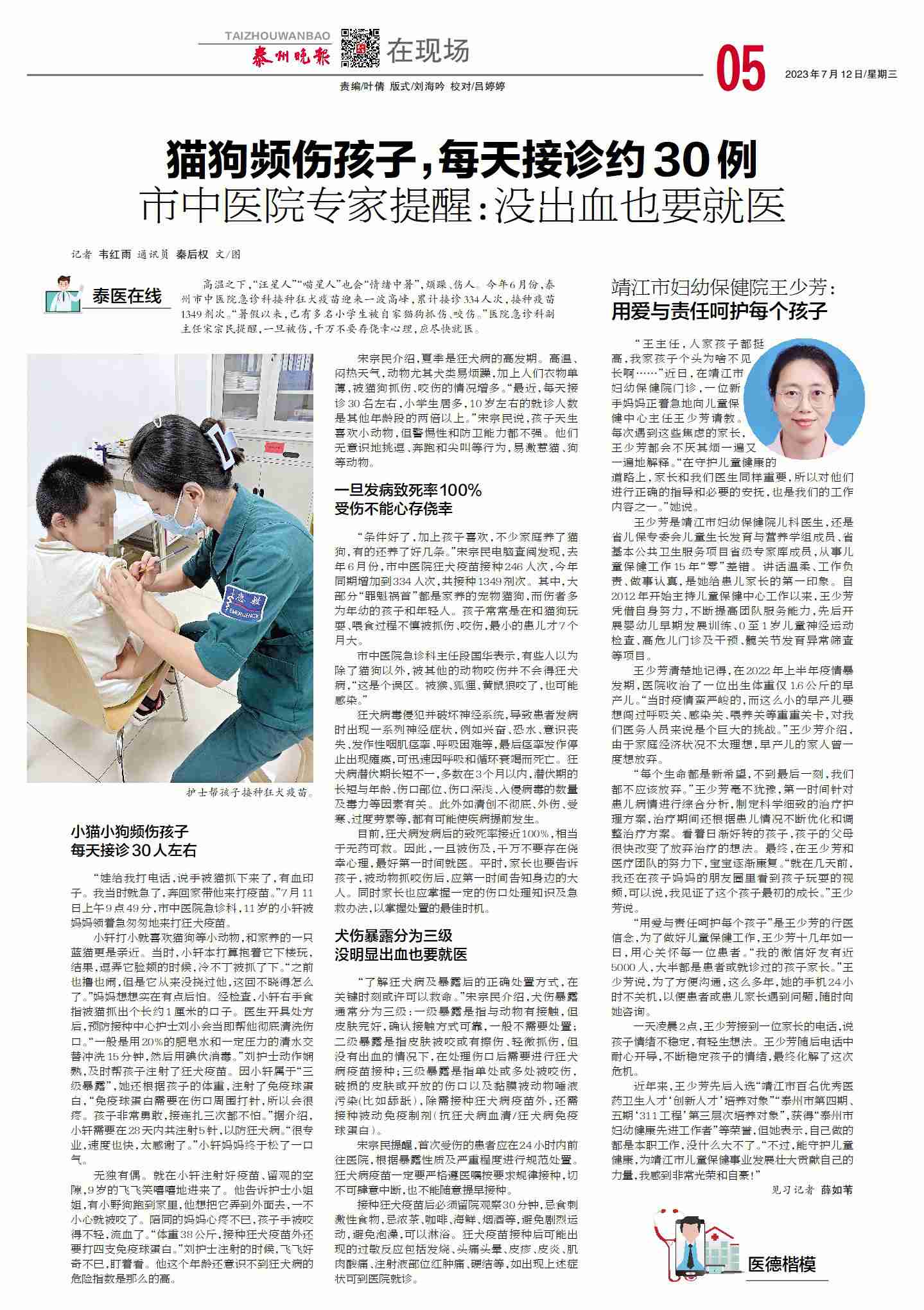 【泰州晚報7月12日】貓狗頻傷孩子,每天接診約30例市中醫院專(zhuān)家提醒:沒(méi)出血也要就醫
