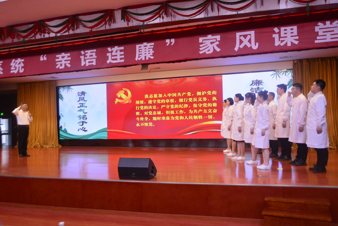 為深入貫徹落實(shí)黨中央、省委、市委關(guān)于黨風(fēng)廉政建設工作要求,積極構建“黨風(fēng)清正、院風(fēng)清朗、醫風(fēng)清新、行風(fēng)清明”的醫療從業(yè)環(huán)境,結合黨紀學(xué)習教育和廉政教育系列活動(dòng)要求,5月17日下午,泰州市衛健系統“親語(yǔ)連廉”家風(fēng)課堂在我院開(kāi)講。泰州市衛生健康委員會(huì )黨組書(shū)記、主任全冬明,市紀委監委第十四派駐紀檢監察組組長(cháng)陳功、委領(lǐng)導班子成員、委機關(guān)各處室負責人、委屬各單位負責人,我院領(lǐng)導班子成員、醫院中層干部及部分重點(diǎn)崗位干部家屬等參加活動(dòng)。